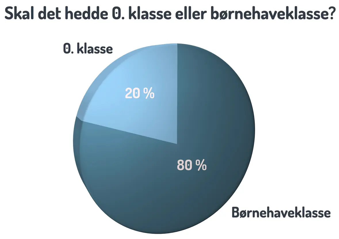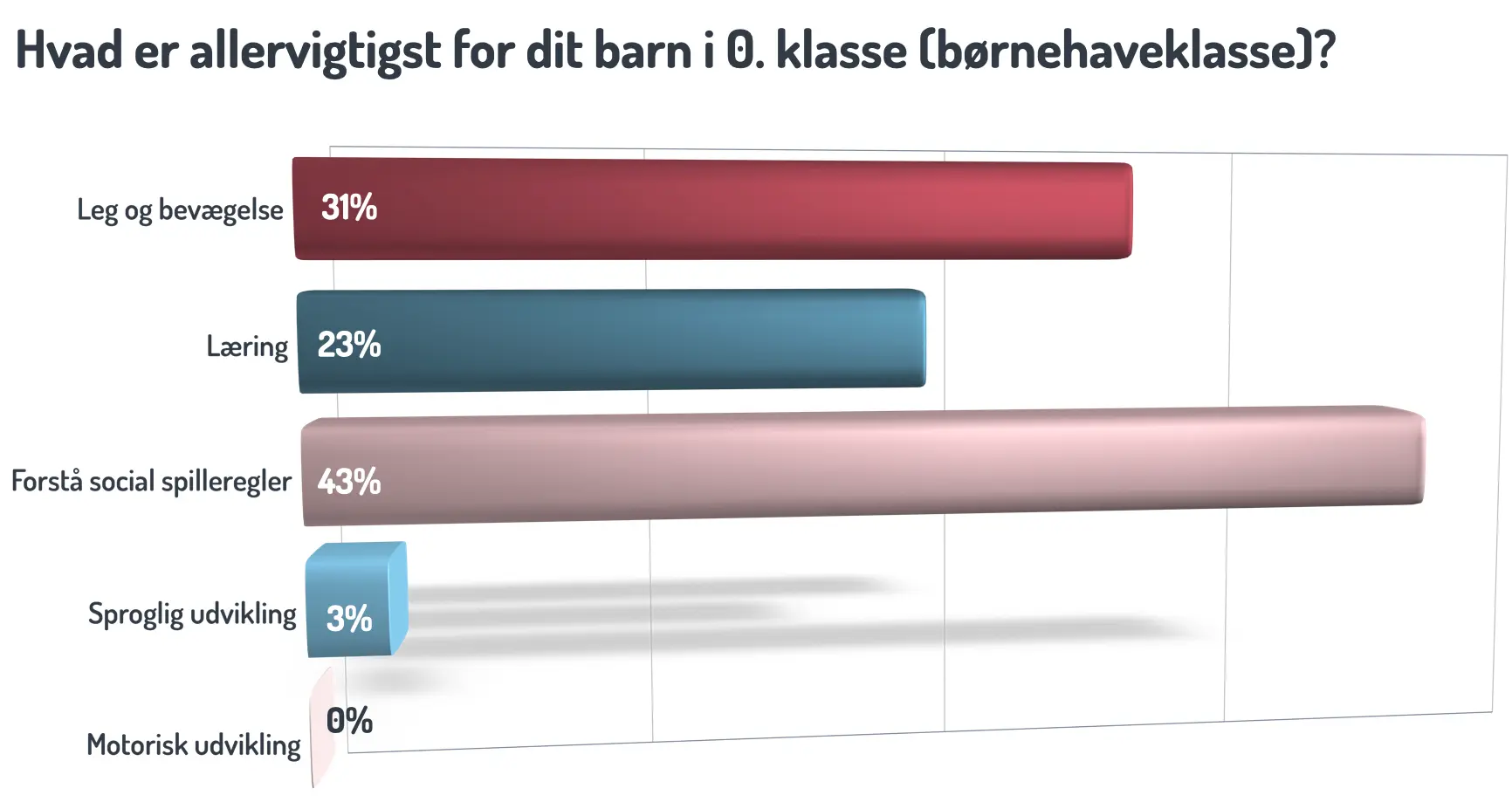 At 23 procent siger læring, passer meget godt med, at 20 procent helst vil kalde det første skoleår for 0. klasse. I deres forklaringer lyder det igen og igen: Fordi børnene synes, det er sejt at begynde i skole, og de er stolte over endelig at være store nok til at komme videre fra børnehaven. Desuden giver 0. klasse et klart og realistisk signal om, at nu begynder der noget andet. Og skolen skal være noget andet end børnehaven.