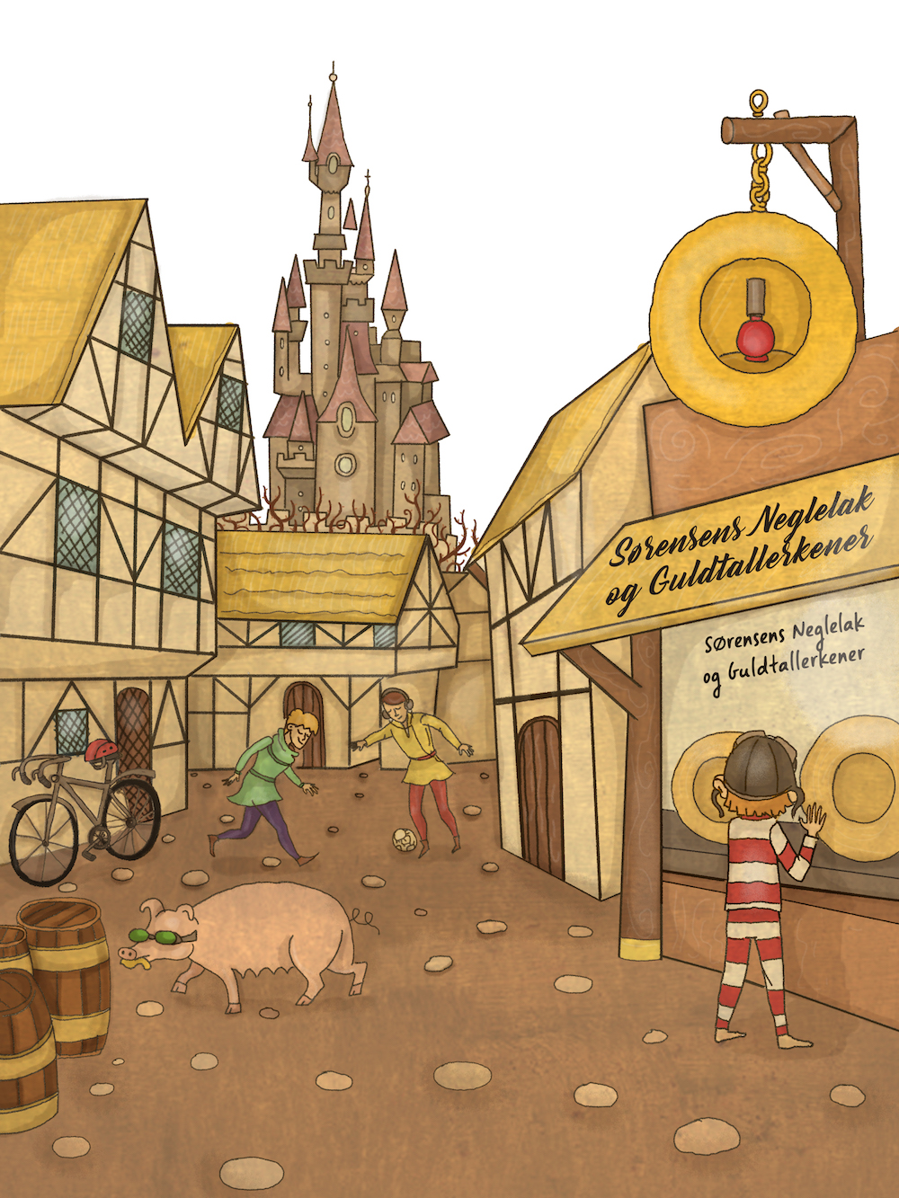 Det er virkelig en by fra gamle dage. Den ligner slet ikke din hjemby. Gaderne er smalle, og husene er vinde og skæve og har lave døre. Børn løber rundt og leger, og mænd trækker store vogne med hø og kartofler efter sig. En gammel kone jagter nogle høns, der er sluppet ud af deres bur. En gris grynter fornøjet, mens den spiser dampende affald fra rendestenen. Folk kigger på jer med store øjne, da I går forbi. Men de ser mest af alt ud til at være kede af det.