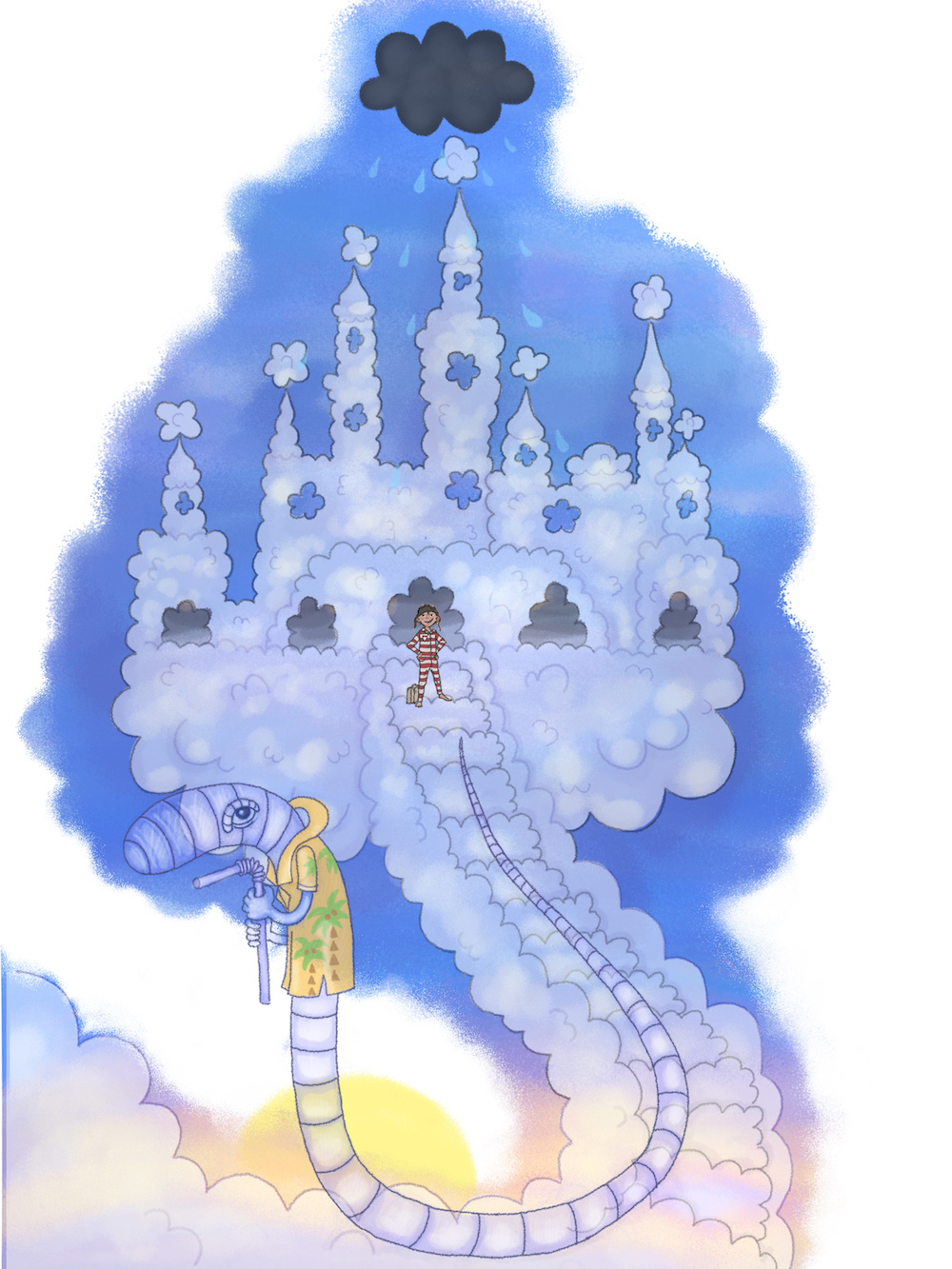 Alt omkring dig er hvidt, og du ligger meget blødt. Nu husker du, at du er oppe på skyerne i Skykongen Knuds rige! Det skarpe lys kommer fra solen, som er ved at stå op.