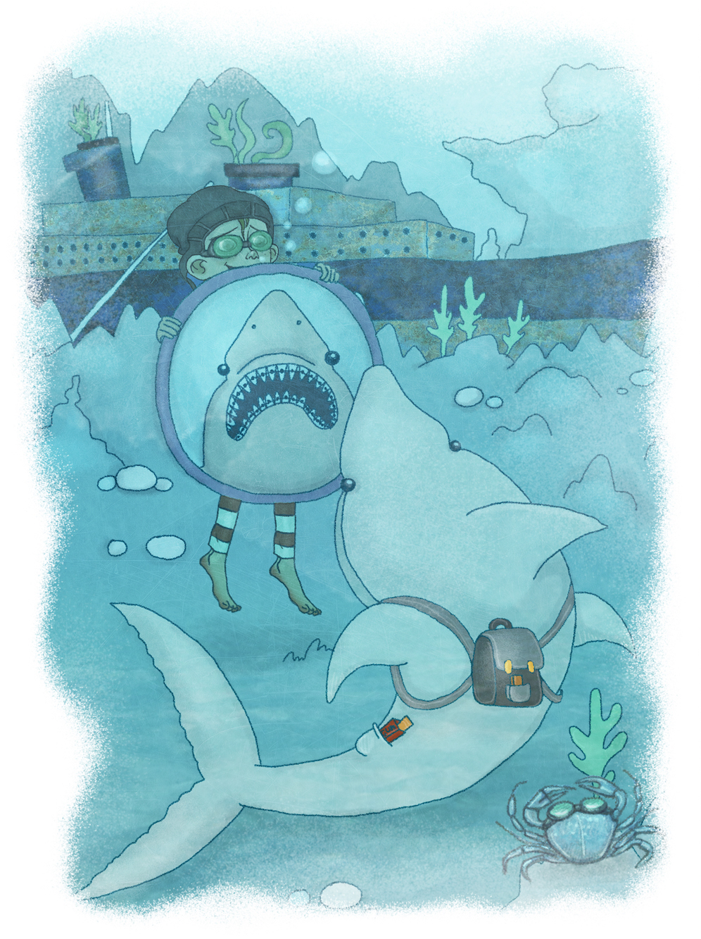 I svømmer gennem en stor grotte under vandet oplyst af selvlysende krystaller. Snart bliver grotten til en tunnel, og for enden kan I se lys. I svømmer ud af tunnelen og kommer ud i havet. Solens stråler skærer som lyssværd gennem vandet. I svømmer opad. Da du får hovedet over vandet, ser du, at I er i en bugt med klipper rundt om. Vandet er tyrkis og meget klart. Det er et smukt og roligt sted. Under dig ser du et koralrev med farvede sten og mærkelige planter. Fisk i alle former svømmer rundt i koralrevet som levende bolsjer med finner. Rundt omkring flyder små skyer. Nogle er hvide og på vej ned mod havet, andre er grå og på vej op mod himlen.
